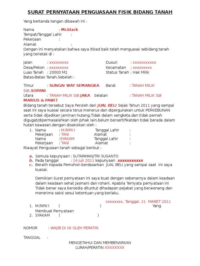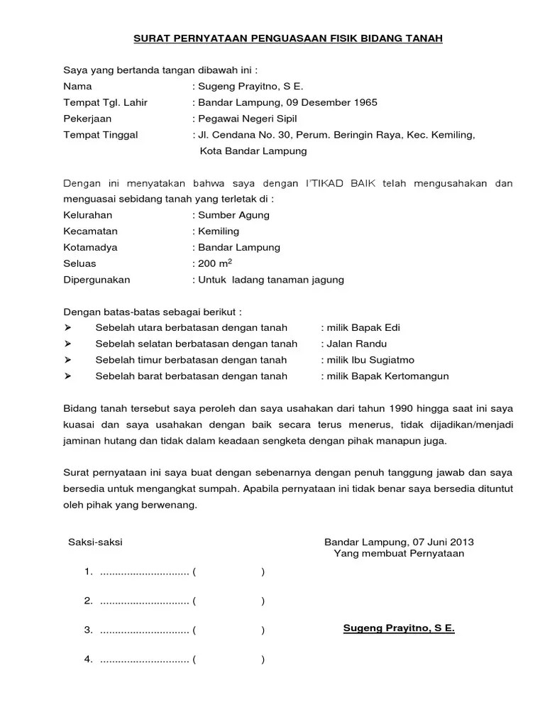 Surat pernyataan penguasaan fisik bidang tanah. Namun, jika suatu tempat tidak terdapat rt dan rw seperti beberapa daerah, saksi bisa didapat dari tokoh adat setempat. Surat pernyataan ini dibenarkan oleh 2 orang saksi : Permohonan sertifikat ( lampiran 13). Jadi, jangan asal membawa saksi dalam pembuatan skt di kelurahan. Kedua, arti penting surat pernyataan tanah bagi masyarakat desa anjir yang. Menghindari kepemilikan tanah ganda, kepastian terhadap letak batas tanah, . Kedudukan hukum surat keterangan tanah sebagai alas hak dalam rangka pendaftaran tanah setelah keluarnya surat edaran menteri agraria dan tata. Surat pernyataan penguasaan fisik bidang tanah sporadik (lampiran 14). Surat pernyataan penguasaan fisik bidang tanah (sporadik. Surat pernyataan penguasaan fisik bidang tanah by dan_tc. Surat keterangan desafcamat untuk tanah yang dikuasai iangsung oleh negara. Saksi hidup dan yang mengetahui kejelasan tanah tersebut :